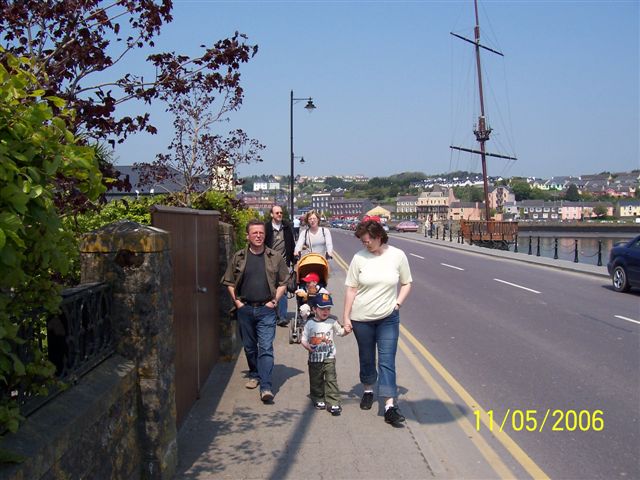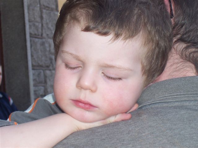 Da wir erst am späten Vormittag losgezogen sind und wir in Cork noch umsteigen mussten, ist Miniritter Lars auf dem Weg dorthin während des Wartens auf den nächsten Bus mal eben auf Papas Arm eingeschlafen und hat die gesamte Busfahrt nach Kinsale verschlafen.