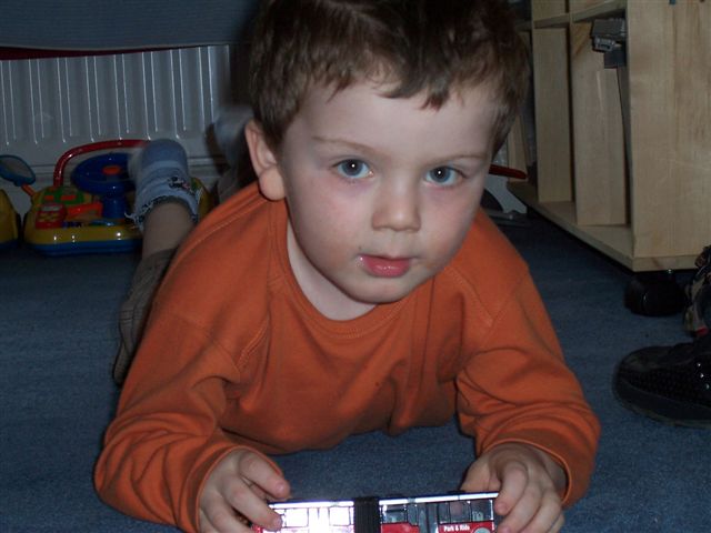 Eine von Lars´ Lieblingsspielstellungen, wenn er mit Autos spielt - auf dem Bauch oder auf der Seite liegend, die Räder beobachtend.