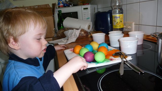 Nils wollte immer und immer wieder die Eier in den Farben baden - so kamen dann ganz eigentümliche Färbungen zustande.