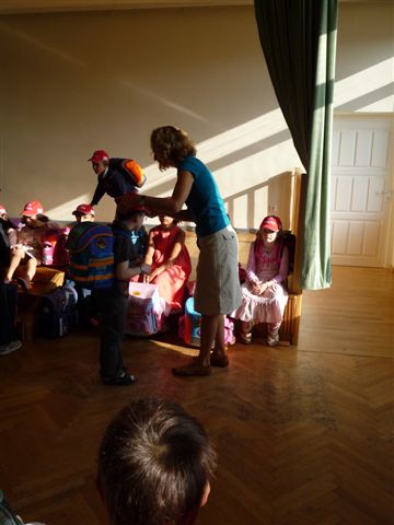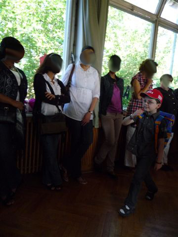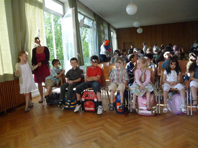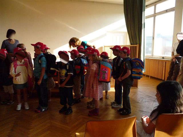 Dann endlich, nachdem u.a. die dritten Klassen ein Willkommenslied gesungen haben, die Akrobatik-Gruppe etwas vorgeführt hat, werden die Kinder in ihre Klassen aufgeteilt und bekommen die "I-Dötzchen-Mütze"