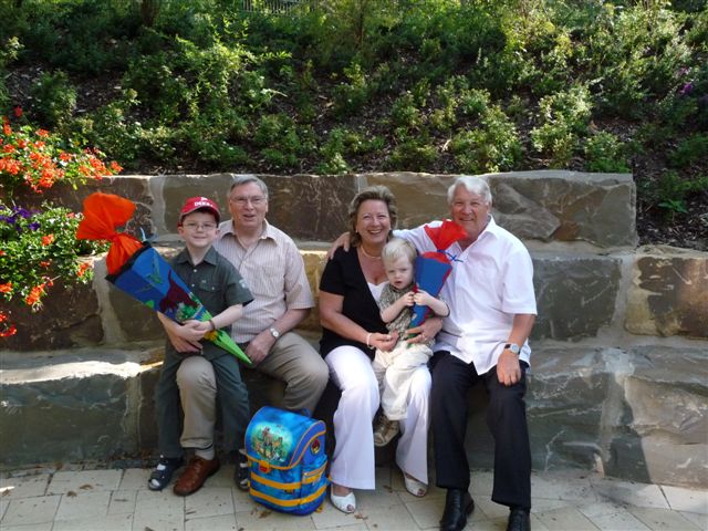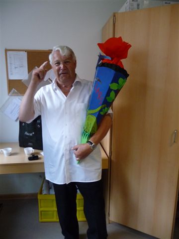 Opas probieren, wie es sich mit Schultüte anfühlt.