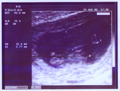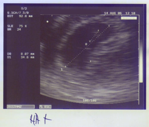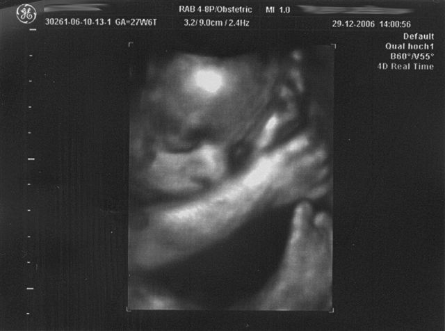 6 Wochen sind es also jetzt noch bis zum errechneten ET. Mann, wie die Zeit gerannt ist. Bei der letzten VU war auch alles in Ordnung, Krümel Kobold, der nu auch seinen Namen hat, ist immer noch zeitgerecht entwickelt, der Dopplerschall war super in Ordnung, nur versteckt hat er sich. Der Doc hätte uns gerne nochmal ein neues 3D-Bild gegönnt, aber Krümel musste sich ja "verstecken" und die Arme und Hände vors Gesicht legen - so ein Schlingel.