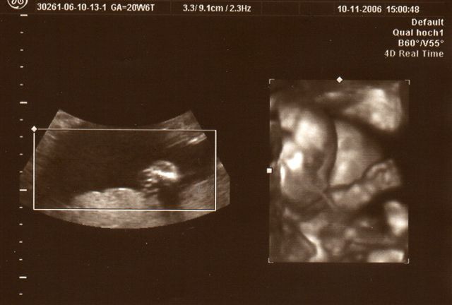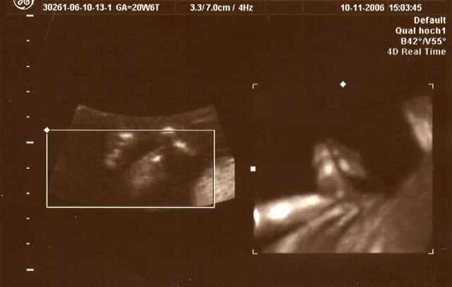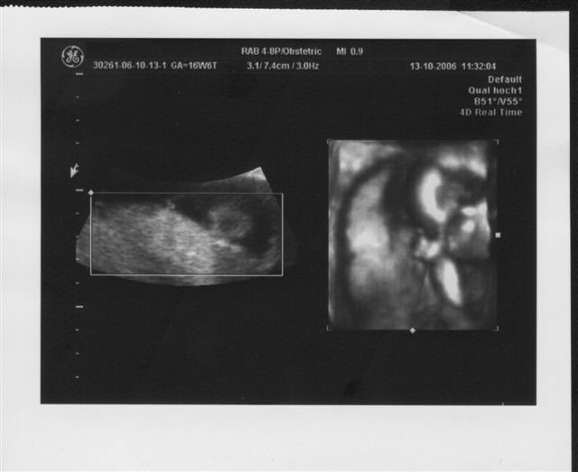 Wieder war ich beim "Partner-Doc". Dieses Mal stand das 2. Screening an, das um die 20. Schwangerschaftswoche herum gemacht wird. Wahrscheinlich hätte "mein" Doc seinen Partner eh gebeten dies durchzuführen, weil er das modernste Gerät hat. Ich hab dann so nebenbei erfahren, dass er wohl der einzige Doc in Düsseldorf ist neben dem Praenatal-Zentrum und der Diakonie, der dieses Ultraschallgerät besitzt. Was ich bzw. wir bei diesem großen Ultraschall zu sehen bekommen haben, war umwerfend und zugleich auch ein bißchen erschreckend - erschreckend nicht, weil mit Krümel etwas nicht in Ordnung ist, sondern weil man so unglaublich viel sehen kann, also positiv erschreckend. Jedenfalls ist alles in bester Ordnung. Jedes Organ ist da wo es hingehört und funktioniert so wie es funktionieren sollte, nichts fehlt. Krümel ist zudem zeitgerecht entwickelt, sehr beweglich und aktiv. Außerdem lag Krümel so günstig, dass der Doc zwischendurch auf 3D bzw. 4D-Realtime umschalten konnte und wir so faszinierende Bilder gesehen haben. Die schönsten hat er mit ausgedruckt. Eines davon seht ihr oben. Und einen Fuß hat er noch "eingefangen". Der Kopfumfang ist seit dem letzten Mal um fast 3 cm gewachsen und Krümel ist insgesamt geschätzt 16 cm lang, wobei dies ein reiner Schätzwert ist und sowohl nach unten, eher aber nach oben abweichen kann. Ich bin sooo glücklich dass alles in Ordnung ist. Lars´ Augen haben beim Anblick der "Fotos" geleuchtet und meinte: "Mami, ich hab das Baby sooooo lieb!"
