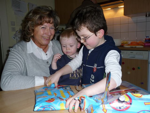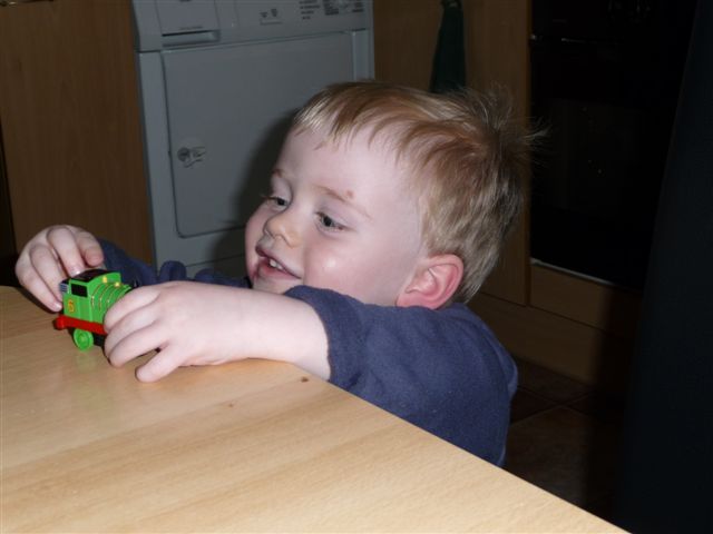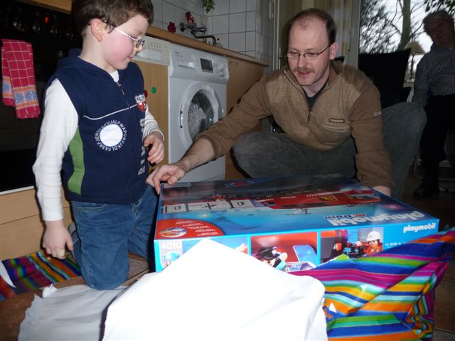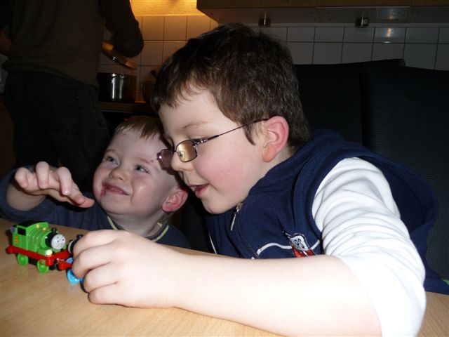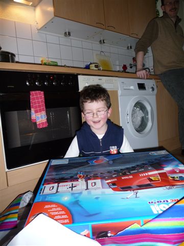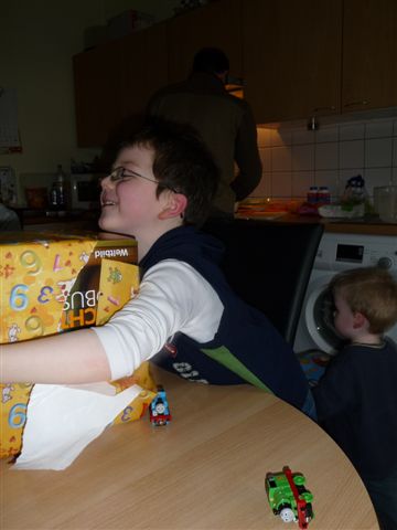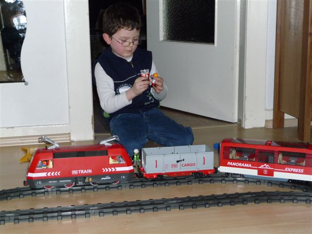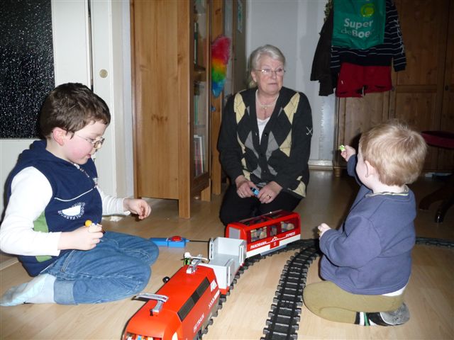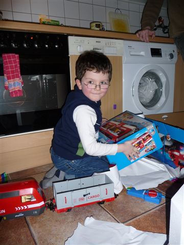 Omi hat nachmittags für die zwei statt Schoki zwei kleine Lok mit Licht und Sound mitgebracht..