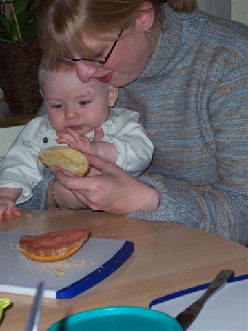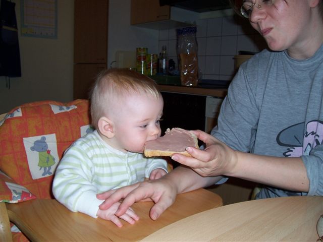 Mami, lass mich mal beißen! Dieser kleine Rabauke gibt aber nicht eher Ruhe, bis er probieren darf, was Mami oder Papi sich da so einverleiben.