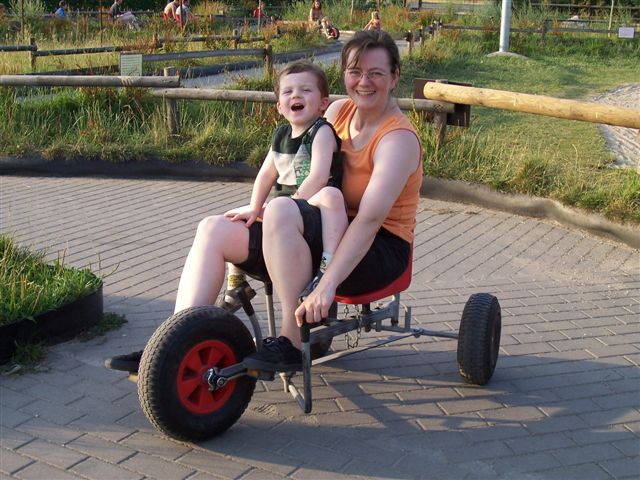 Mami mit Lars. Alleine durfte er noch nicht und wär eh nicht an die Pedale gekommen.