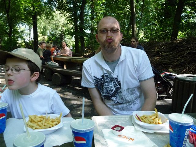 Blödsinn bei der Snackpause - ja, wie waren diesmal faul und haben außer Getränken (was Mami dem Papi wohl besser gesagt hätte) nix mitgenommen und uns statt dessen eine Pommes gegönnt.