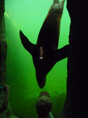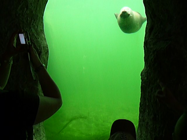 ....abtauchte und wieder verschwand. Auch das war dem Krümel nicht geheuer, da zeigt sich die unterschiedliche Wahrnehmung beim Erwachsenen und beim Kleinkind - die schützende Scheibe hat er gar nicht realisiert, er hat nur den Seehund auf sich zukommen gesehen....