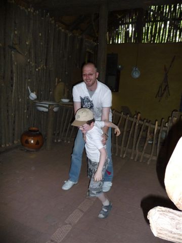 Papa und Lars haben Spaß in einer der typischen Hütten....