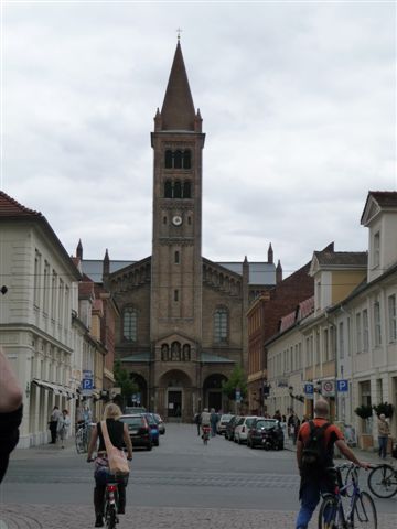 Von der Brandenburger "Shopping"-Meile ein Blick auf die Katholische Kirche Sankt Peter und Paul.
