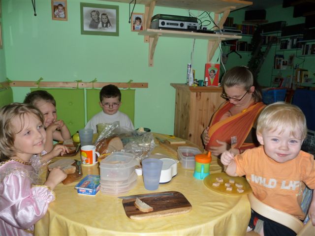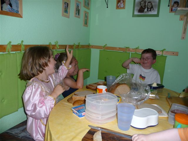 Spaß am Frühstückstisch - das jüngste Lämmchen dabei an seinem Lieblingsplatz.