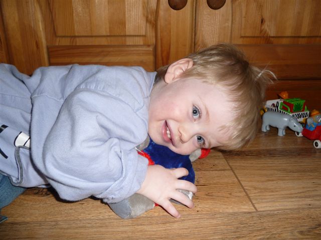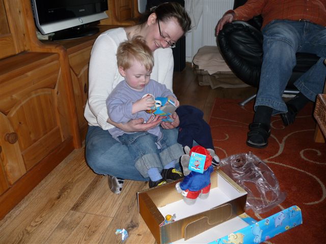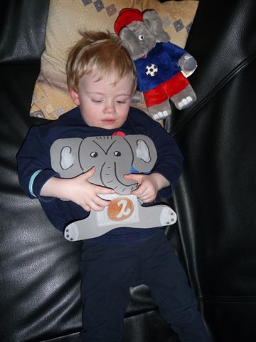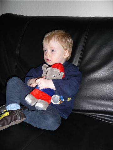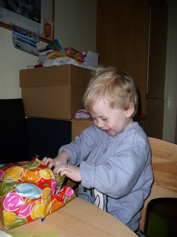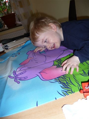 Tja und dann hat er noch ein eingepacktes Päckchen entdeckt.... mit elefantiger Bettwäsche, die Mami dann auch sofort gewaschen hat und in den Trockner geworfen hat.....