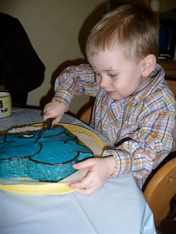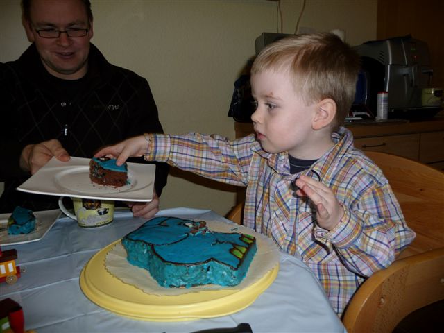Er hat den Kuchen die ganz Zeit verteidigt - "Nein, das nicht ham" - und hat ihn dann doch letzten Endes angeschnitten....