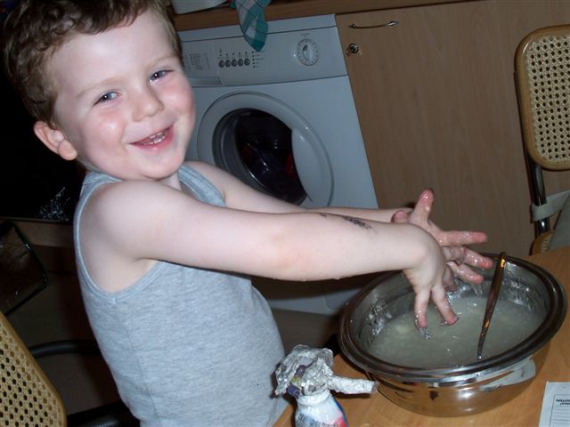 Los geht´s - Kleister ist ja nicht nur zum Kleben von Pappmaché, sondern eignet sich hervorragend, um "Teig zu machen, Mami"