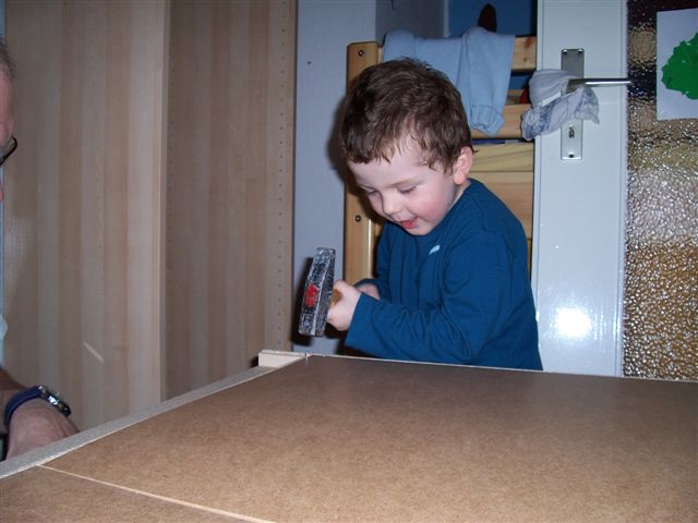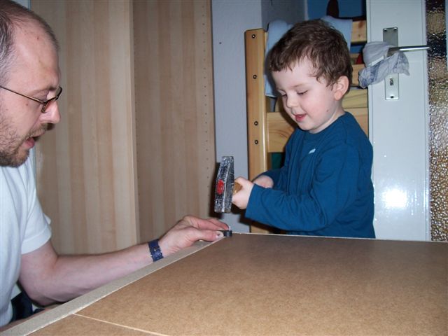 Papa hat Zwergi dann doch an den "Erwachsenenhammer" gelassen und zu Mamis Erstaunen und letztendlich Stolz hat der kleine Mann die große Aufgabe meisterhaft gemeistert - ohne Papas Finger zu zerhämmern und ohne Schäden am Schrank.