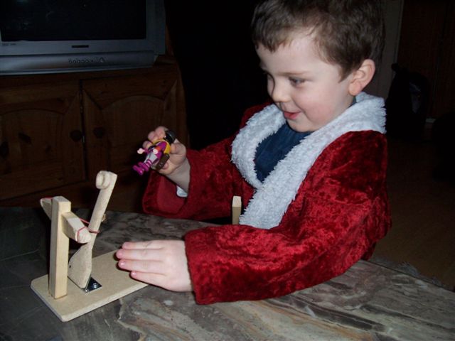 Morgens schon kam Mamis Bruder vorbei und hat dem Zwerg versprochen abends mit ihm mit der Ritterburg zu spielen. Grund genug, um mit Papa in den Keller zu verschwinden und "mal eben" ein Katapult zum Angriff auf die Burg zu werkeln, welches sich natürlich jetzt In Besitz vom Zwerg befindet.