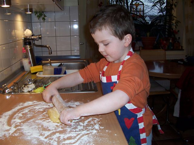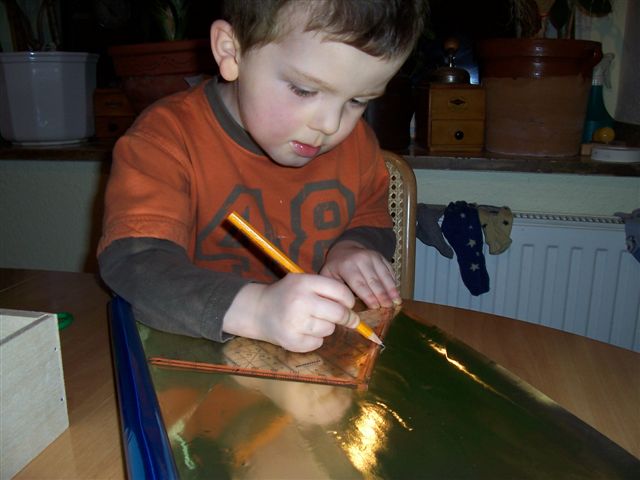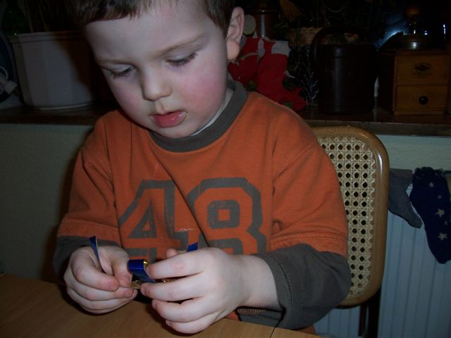 Ganz toll macht der Zwerg das schon mit Ausschneiden, Kleben, etc. pp. - bloß die Geduld fehlt noch ein bißchen. Eine kleine Girlande und ein Stern - mehr wollte er nicht.