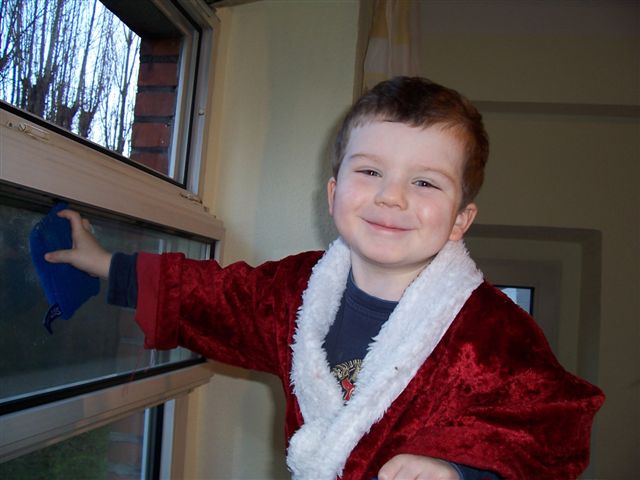 Der fleißige Weihnachtsmann hilft Mami beim Fensterputzen....