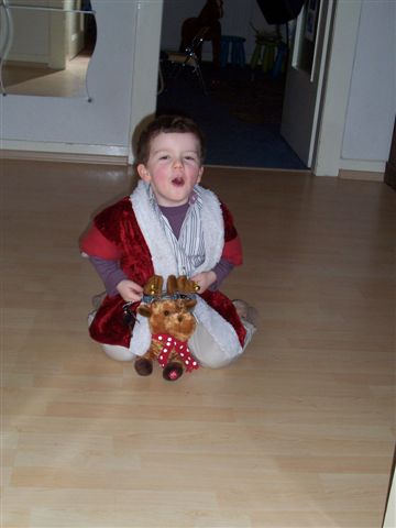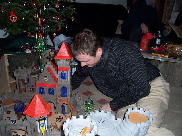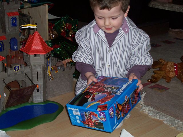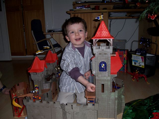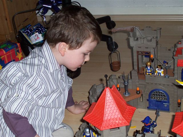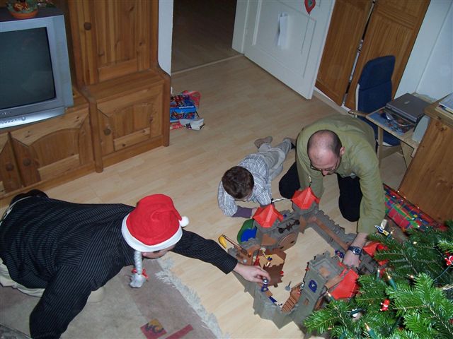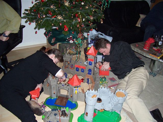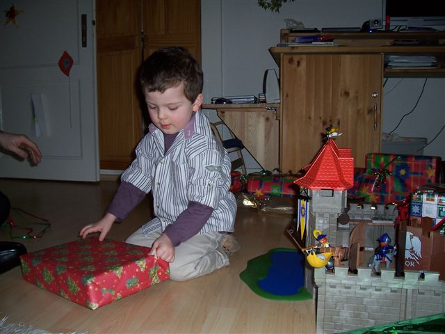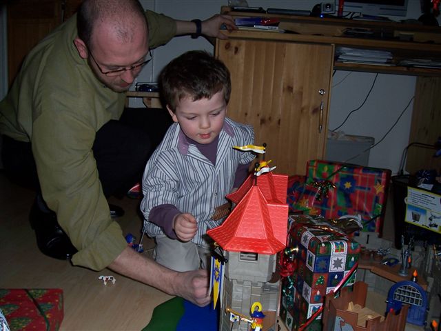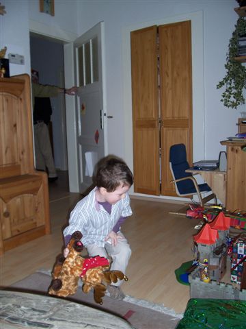 Lars will das nicht so recht einsehen "Aber ich muss doch gucken, ob der Weihnachtsmann die Burg hingestellt hat, sonst muss ich noch Bescheid sagen....." verzweifelter Blick....
